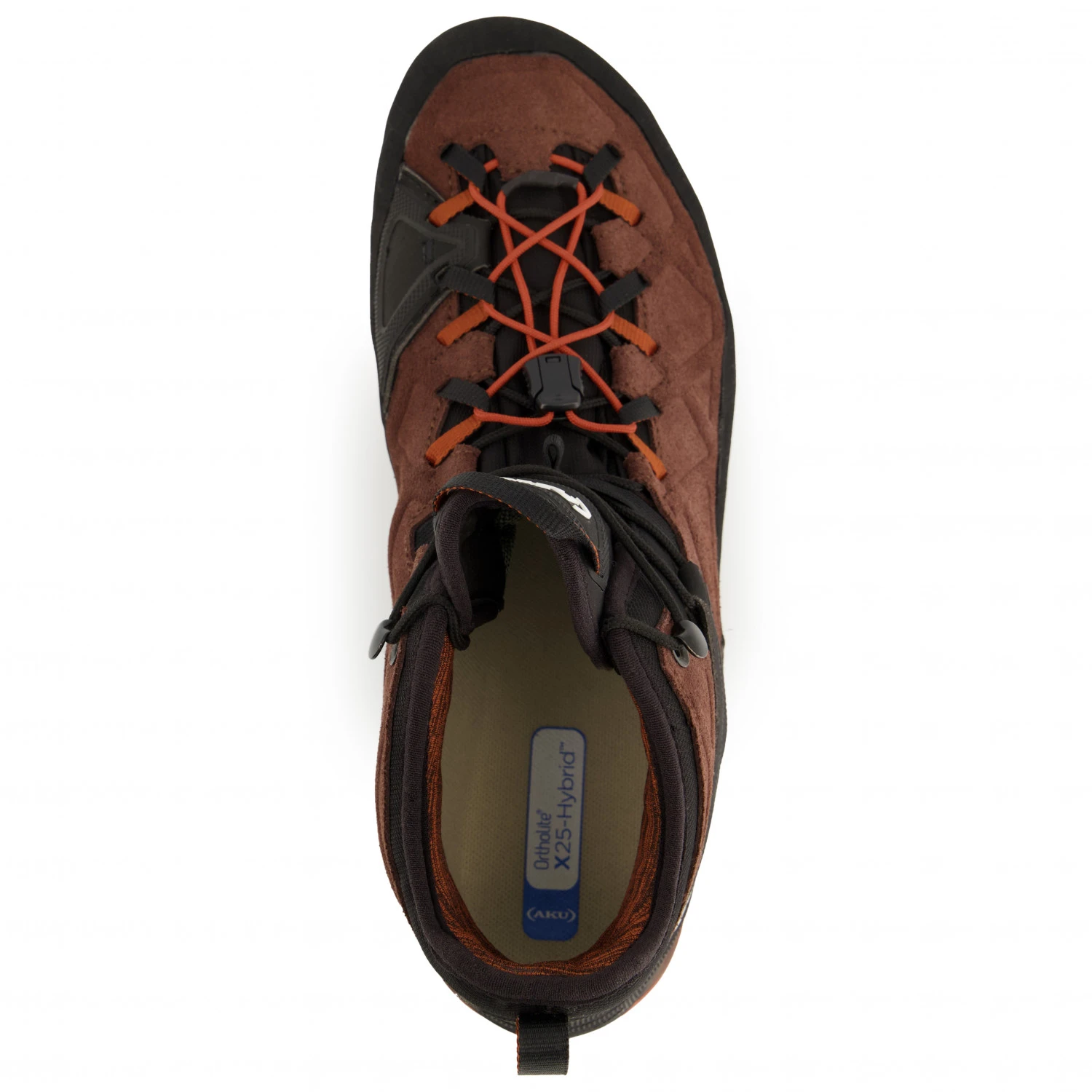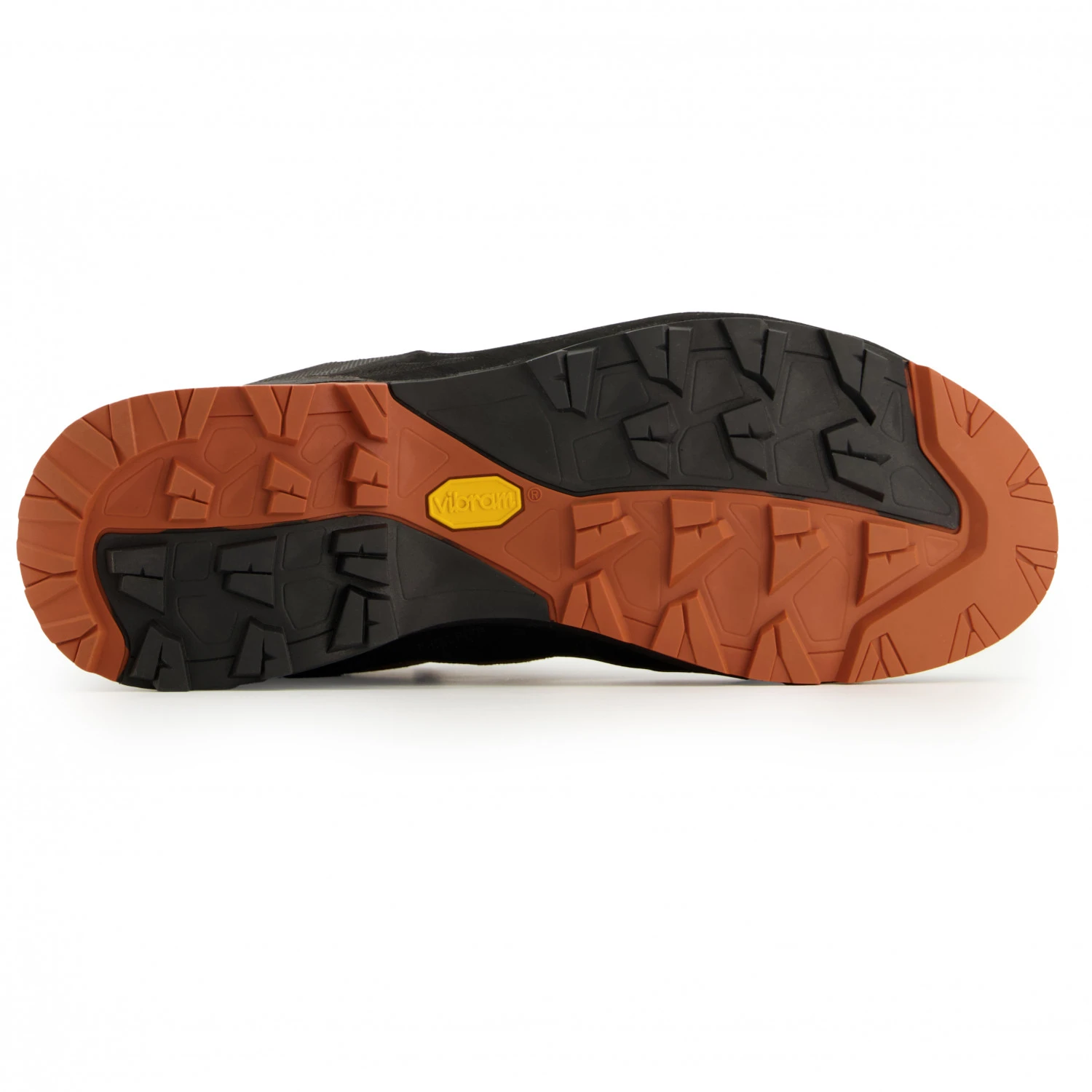 Reliably robust, lasting and lightweight at the same time: the Rock DFS Mid GTX approach shoes by AKU! These highly functional mountain sports shoes are suitable for approaches, easy climbs, via ferrata and rough mountain trails. Their characteristic forefoot construction surrounds and protects the midsole inside with a special strap. This stability is supported and provided with ideal shock absorption by the Internal Midsole System with its exoskeleton structure and feather-light PU interior. This is complemented by the Vibram Approcciosa sole with a Megagrip high-performance compound, offering maximum firmness and traction.