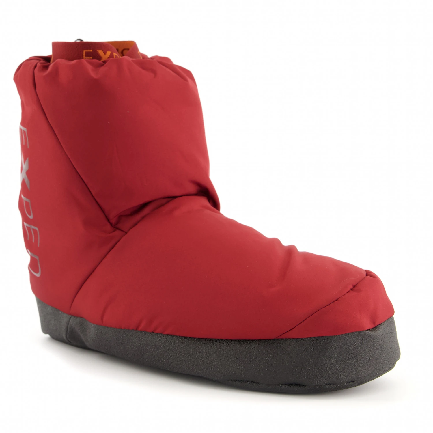 The Camp Booty from Exped is a cuddly, warm and soft shoe with synthetic fill you can wear at base camp. If youâre feet are cold when you get to base camp or the winter room of a hut, just slip off your mountaineering or ski touring boots and slip into these soft, warm booties. Itâll feel absolutely fantastic after a hard day in the icy cold weather of the mountains! The Camp Booty is easy to wash and dries quickly as well. Thanks to their non-slip sole, these Camp Booties are ideal for walking a few metres from your tent to the mess tent or to grab snow to melt. The elastic cuff will prevent snow getting in. Shoe size / foot length / weight Size S: 37 – 39 / 25.5 cm / 190 g Size M: 40 – 42 / 27.5 cm / 200 g Size L: 43 – 45 / 29.5 cm / 220 g Size XL: 46 – 47 / 31 cm / 230 g